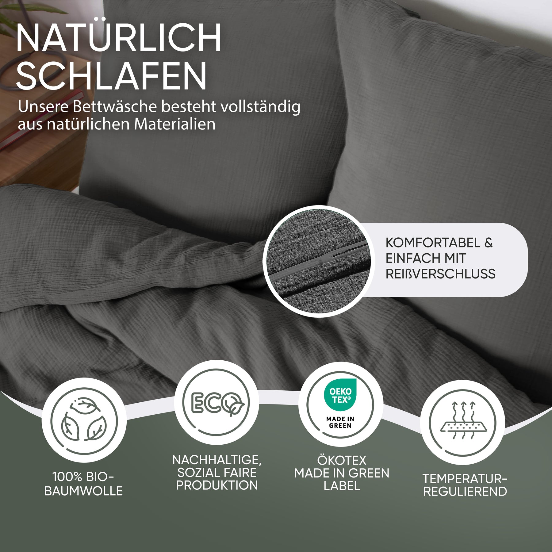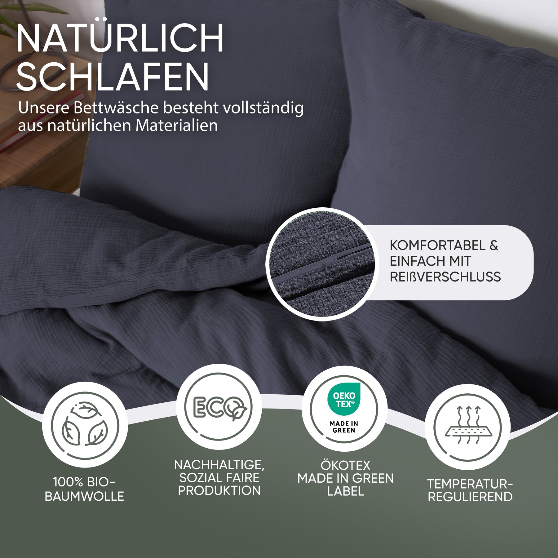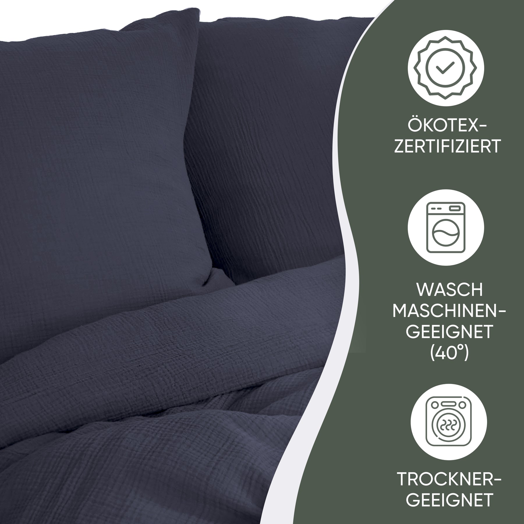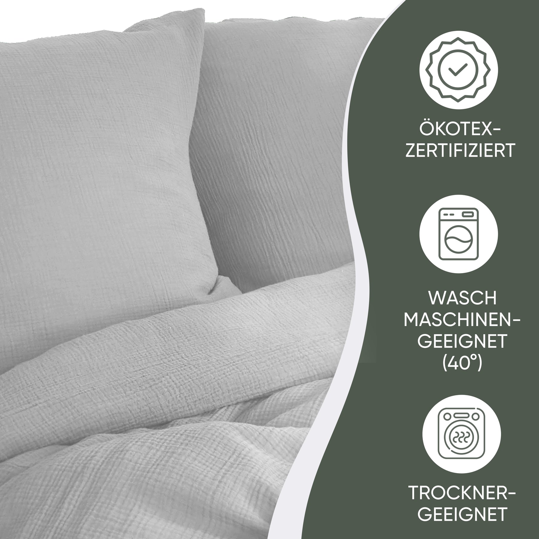 100% Bio-Baumwolle und MADE IN GREEN Oeko-Tex Label. Mit doppellagigem Stoff für besonders weiche Haptik, in vier außergewöhnlichen naturfarben. Selbstverständlich ist unsere Bettwäsche waschmaschinen -und trocknergeeignet (waschbar bis 40 Grad). Wir versprechen eine Produktion an sicheren und sozialverträglichen Arbeitsplätzen und gewährleisten, dass das Produkt mit nachhaltigen Prozessen, unter sozialverträglichen Arbeitsbedingungen hergestellt wurde.