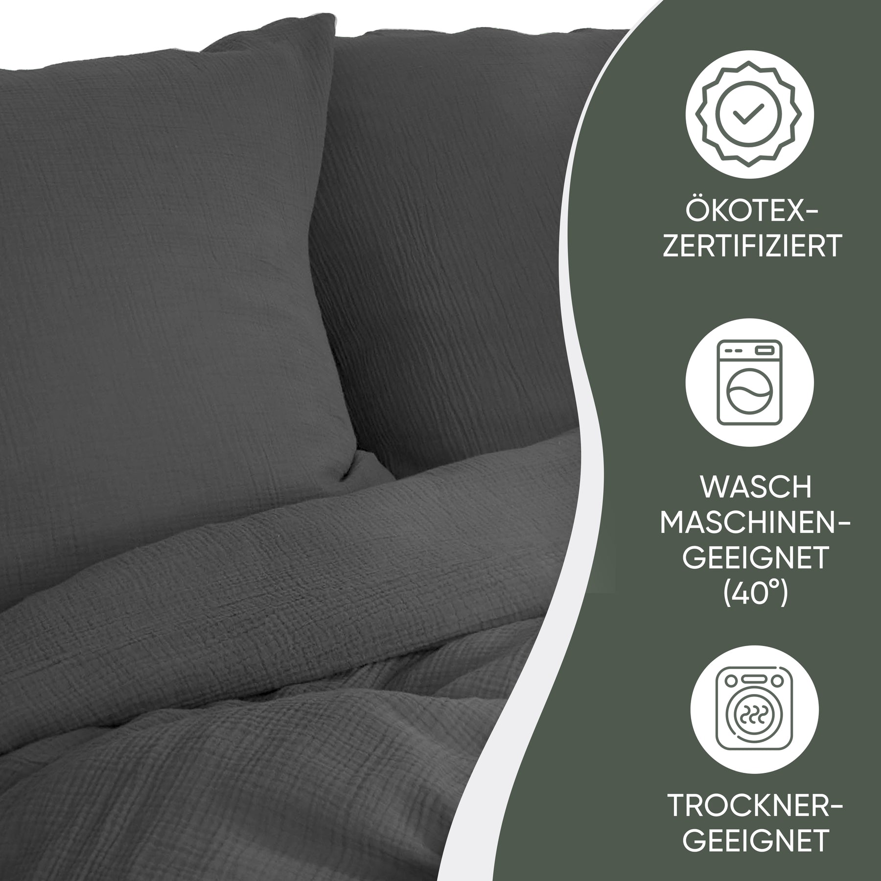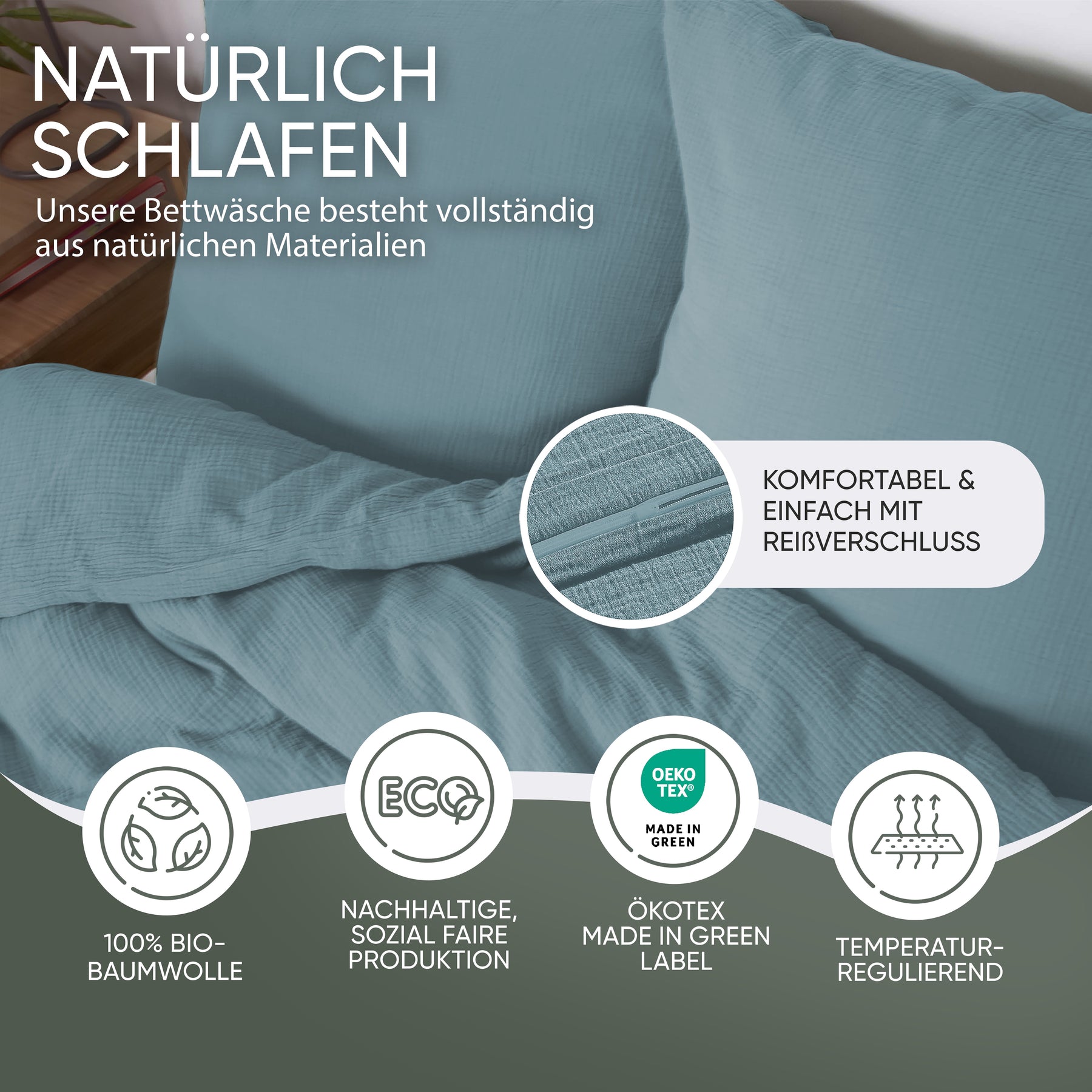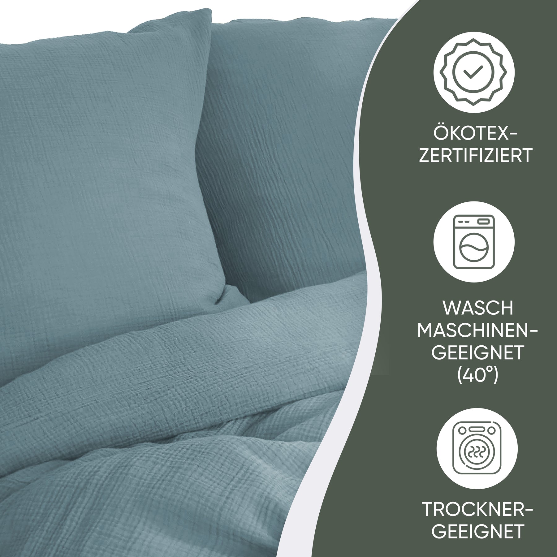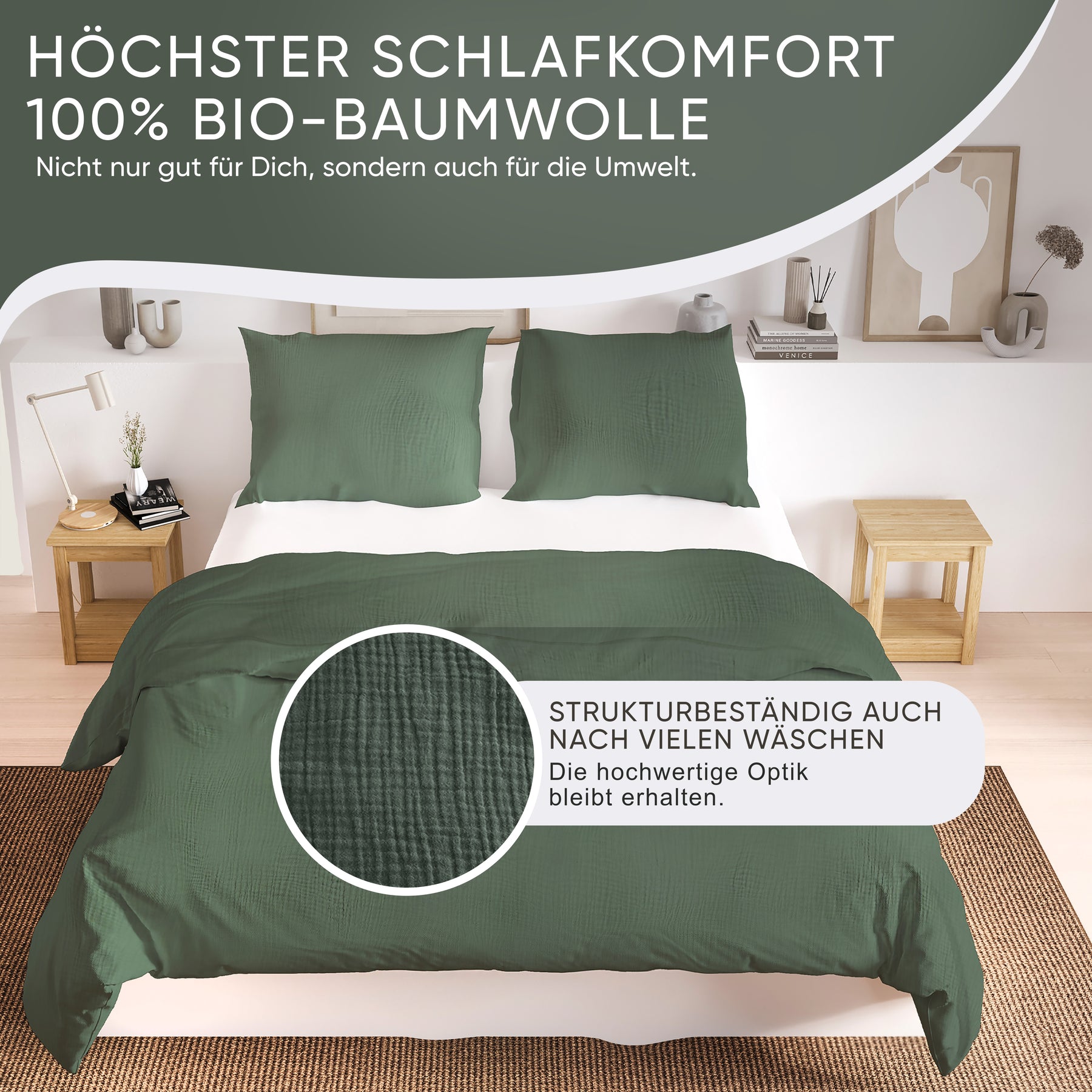 100% Bio-Baumwolle und MADE IN GREEN Oeko-Tex Label. Mit doppellagigem Stoff für besonders weiche Haptik, in vier außergewöhnlichen naturfarben. Selbstverständlich ist unsere Bettwäsche waschmaschinen -und trocknergeeignet (waschbar bis 40 Grad). Wir versprechen eine Produktion an sicheren und sozialverträglichen Arbeitsplätzen und gewährleisten, dass das Produkt mit nachhaltigen Prozessen, unter sozialverträglichen Arbeitsbedingungen hergestellt wurde.