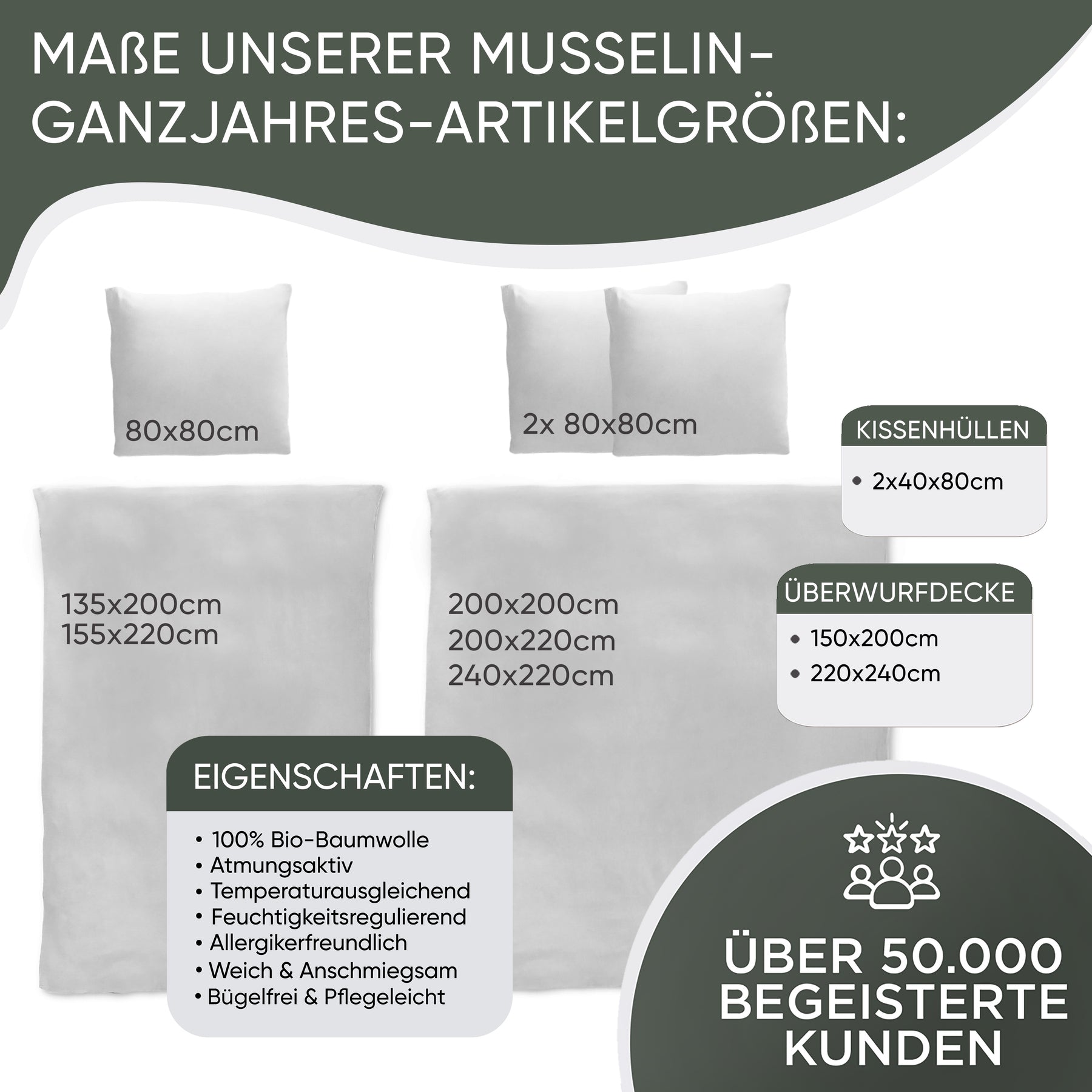 erhältlich in vier verschiedenen Naturtönen in der Größe 135x200 cm + 1x 80x80cm Kissen, 155x220 cm + 1x 80x80cm Kissen und 200x200cm + 2x 80x80cm Kissen. Die Bettwäsche ist pflegeleicht, bügelfrei, hautfreundlich, weich, strapazierfähig und für Allergiker geeignet.